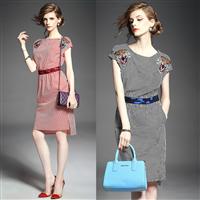 2015夏季新款女装欧美大牌圆领老虎头绣花条纹拼接修身显瘦连衣裙