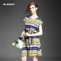 2015夏季新款 圆领撞色横条纹系带修身气质连衣裙显瘦