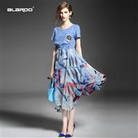 2015夏季新款 牛仔拼接修身系带不规则印花大摆中长连衣裙