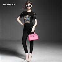 2015欧美时尚V领弹力螺纹拼接印花短T恤+直筒七分裤清凉套装夏