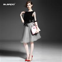 2015夏季女装新款 时尚圆领无袖拼接纱网压褶上衣+字母印花包臀裙