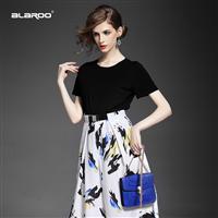 2015 欧美时尚圆领无袖拼接印花短上衣+压褶弹力收腰半身裙套装