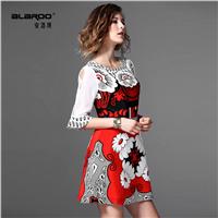 2015春季女装新款圆领蕾丝拼接抽象印花七分袖花边连衣裙