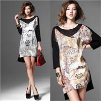 2015品牌女装新款撞色抽象印花圆领真丝七分袖宽松连衣裙