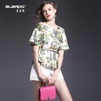 2015夏 欧美圆领喇叭袖露背印花上衣+纯色口袋直筒短裤套装送腰带