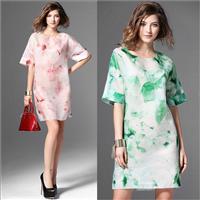 2015品牌女装新款滑肩晕染印花圆领真丝欧根纱短袖连衣裙