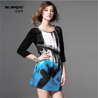 2015品牌女装新款撞色抽象印花圆领真丝七分袖宽松连衣裙