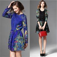 2015春季女装新款圆领印花弹力修身百褶单排扣连衣裙