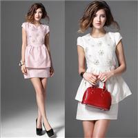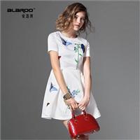 2015春季女装新款气质圆领短袖刺绣印花高腰修身A字连衣裙