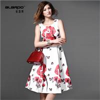 2015品牌女装新款3D印花睡美人收腰显瘦圆领无袖连衣裙