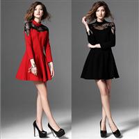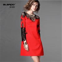 2015春季女装新款立领滑肩袖蕾丝拼接压褶修身显瘦连衣裙