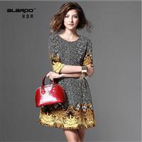 2015春季女装新款圆领复古印花七分袖中腰修身显瘦连衣裙