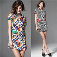 2015春季新款女装立领短袖修身仿真丝印花双口袋连衣裙