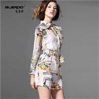 2015品牌女装新款翻领欧洲印花系带修身长袖单排扣连衣裙