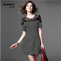 2015春季女装新款圆领蕾丝拼接波点印花短袖修身连衣裙