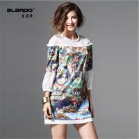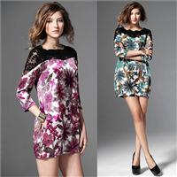 2015春季新款女装圆领蕾丝拼接真丝修身长袖印花连衣裙
