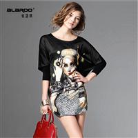 2015春季新款圆领时尚人像印花蝙蝠袖镶钻宽松连衣裙