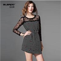 2015春季女装新款 波点印花蕾丝拼接弹力收腰九分袖连衣裙