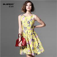 2015品牌女装新款 圆领松鼠趣味印花百褶无袖修身A字连衣裙