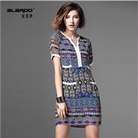 2015新款 立领印花系带修身七分袖显瘦连衣裙