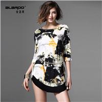 2015春夏季女装新款水墨印花圆领七分袖宽松真丝连衣裙
