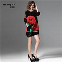 2015春季女装新款 真丝圆领玫瑰花亲肤宽松一步连衣裙