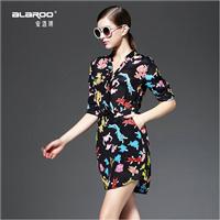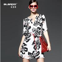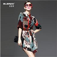 2015春夏季女装新款翻个性印花V领中袖真丝连衣裙