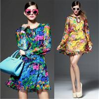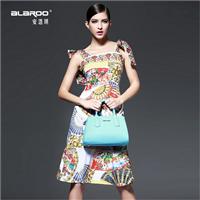 2015春夏女装新款 系带圆领印花收腰压褶大摆修身连衣裙
