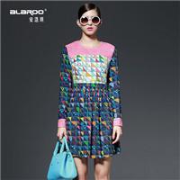 2015春季女装新款 几何印花镂空拼接圆领长袖修身连衣裙