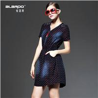 2015品牌女装新款 圆领短袖树叶印花a字裙 修身显瘦连衣裙