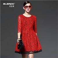 2015春季女装新款 圆领蕾丝拼接七分袖收腰显瘦大摆连衣裙