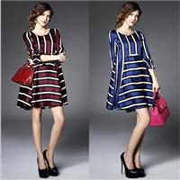 2015夏 圆领七分袖气质条纹拼接宽松大摆a字裙连衣裙