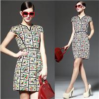 2015春季女装新款 趣味印花圆领收腰包肩袖一步修身连衣裙