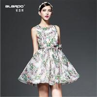 2015春季女装新款 圆领印花无袖系腰带修身大摆A字连衣裙