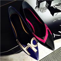 2015春季新款真皮女鞋拼色铆钉单鞋女尖头平底四季鞋