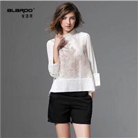 2015春装新款 真丝欧根纱绣花不规则立领九分袖女上衣