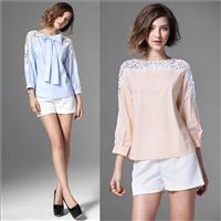 2015夏季女装新款立领蝴蝶结钉珠淑女气质荷叶边拼接纯色衬衫女
