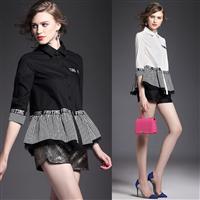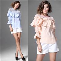 2015品牌女装新款 重工钉珠蕾丝拼接荷叶边压褶纯棉女上衣
