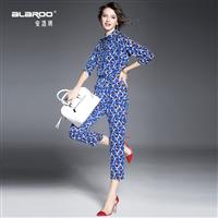 2105夏 欧美大牌翻领单排扣蒲公英印花弹力收腰修身连体长裙裤