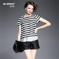 2015夏 欧美时尚不规则后背开叉真丝拼接条纹上衣+阔腿短裤套装