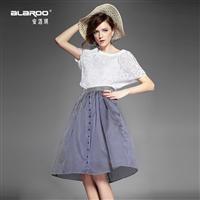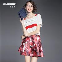 2015夏季女装 欧美大牌袖口蕾丝拼贴短袖T恤+印花半裙两件套