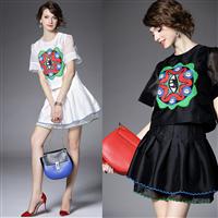 2015夏 欧美大牌短袖网纱印花拼贴上衣+波浪边绣花纯色半裙套装女