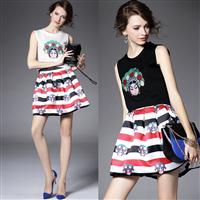 2015夏季女装 中国风京剧脸谱刺绣无袖短T恤+撞色条纹修身半裙