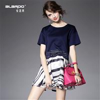 2015夏 圆领短袖钩花镂空纯色短上衣+条纹气质欧根纱半裙两件套女