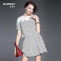 2015夏新款 圆领蕾丝拼接袖口蝴蝶结棉T恤+波点半裙套装