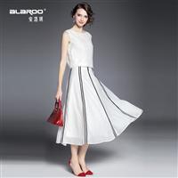 2015夏新品 欧美大牌纯色无袖短上衣+条纹拼接高腰中长半裙套装