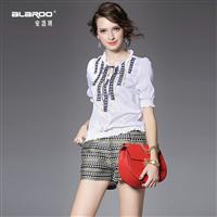 2015夏 欧美大牌翻领中袖时尚纯色重工绣花不规则拼接修身衬衣女