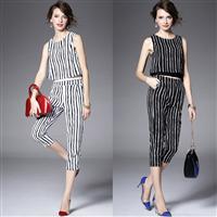 2015夏 无袖圆领蕾丝拼接假两件短上衣+弹力竖条纹显瘦七分裤套装