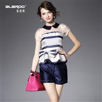 2015夏 翻领网纱拼接蝴蝶结气质条纹短袖修身上衣+绣花短裤套装女