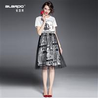 2015夏季女装 圆领短袖梦露印花弹力修身棉T恤+网纱中长半裙套装